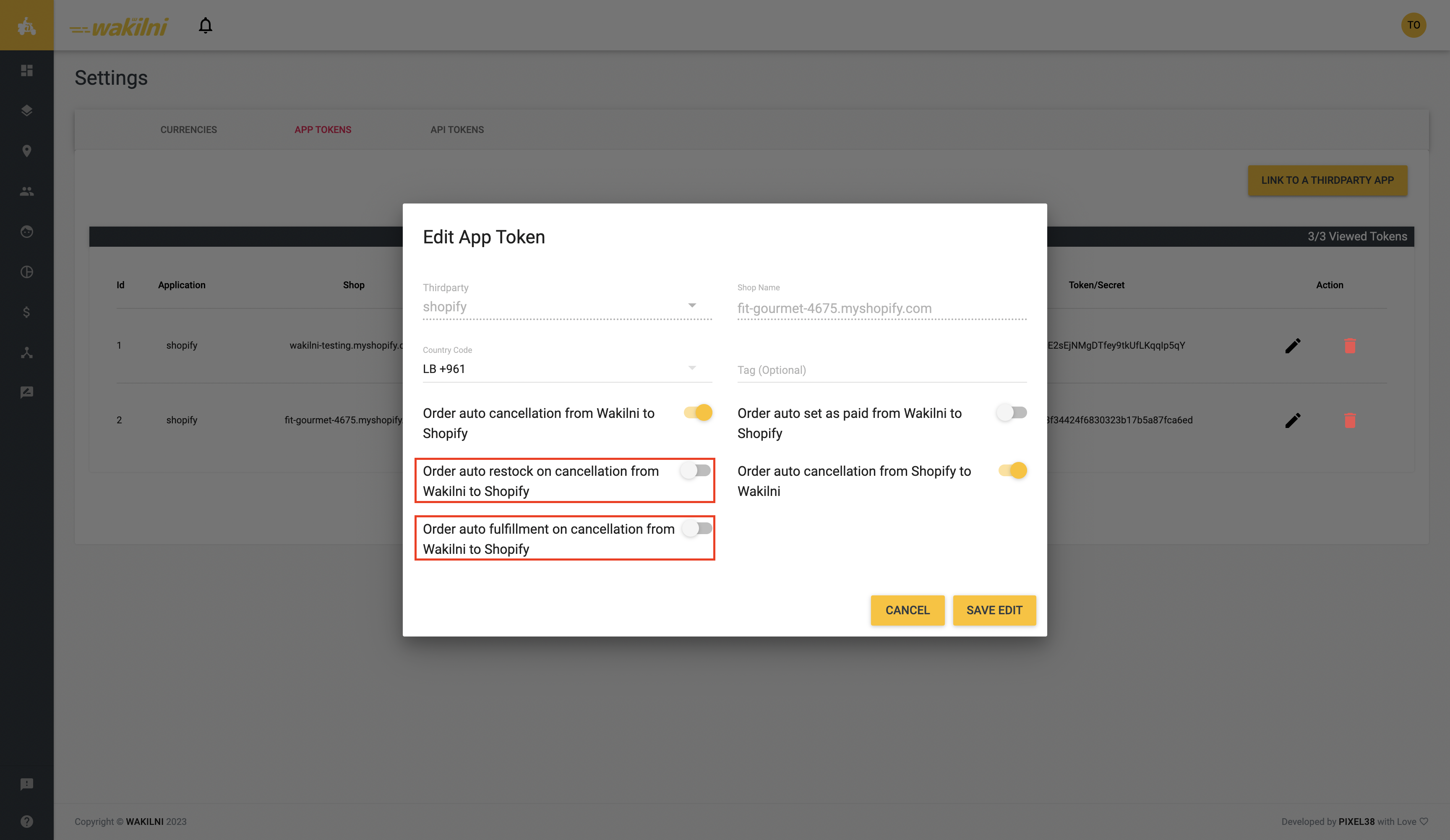 This feature allows the client to customize the auto-fulfillment on Shopify when orders are cancelled on Wakilni. Combined with the auto restock option, this feature controls if orders are unfulfilled on Shopify when cancelled on Wakilni or not. To prevent orders from being unfulfilled and restocked when cancelled on Wakilni, users can turn auto fulfillment” and auto restock OFF from Shopify App Token Settings on Wakilni’s portal. Users might turn those features on if desired.