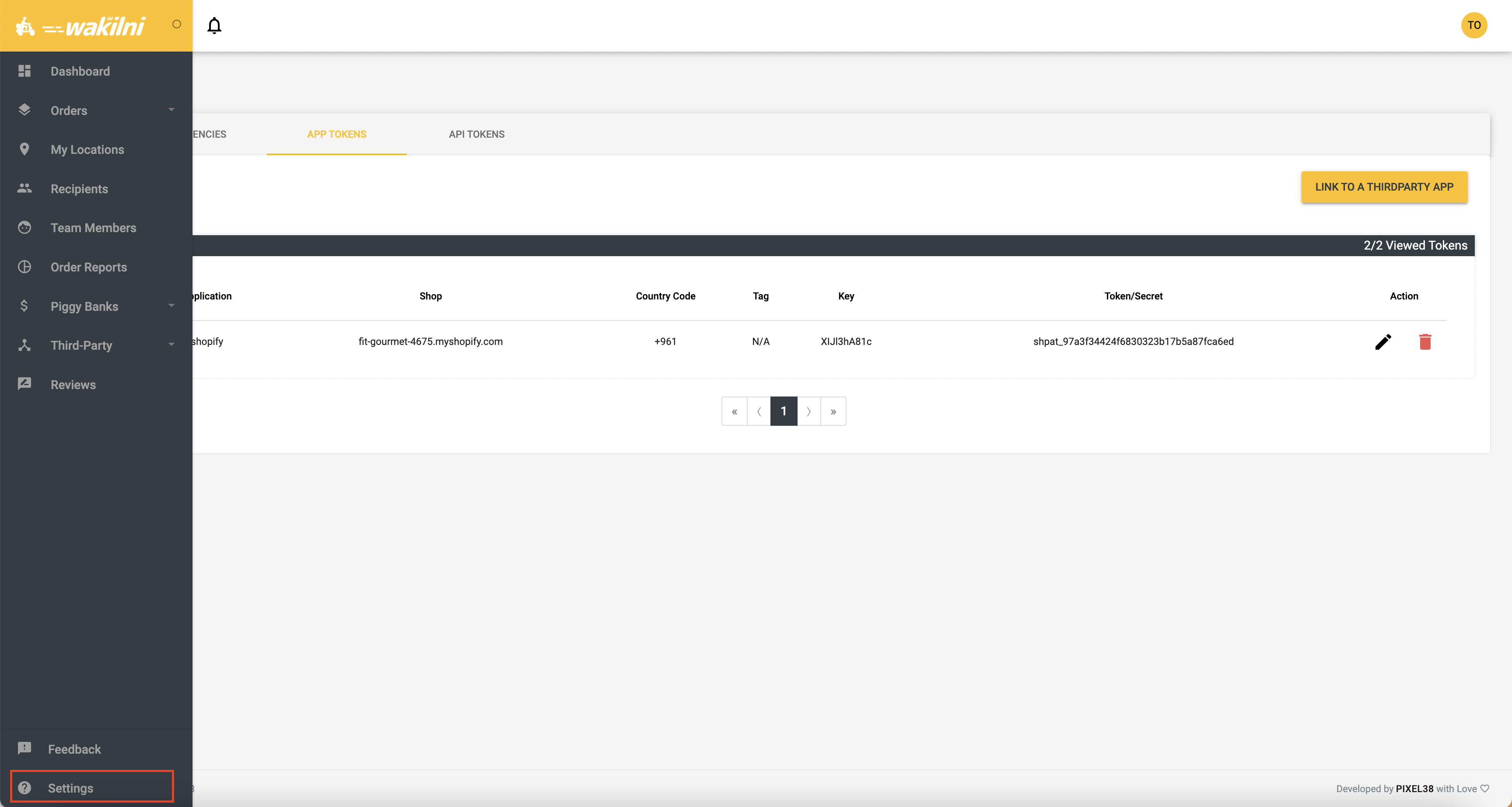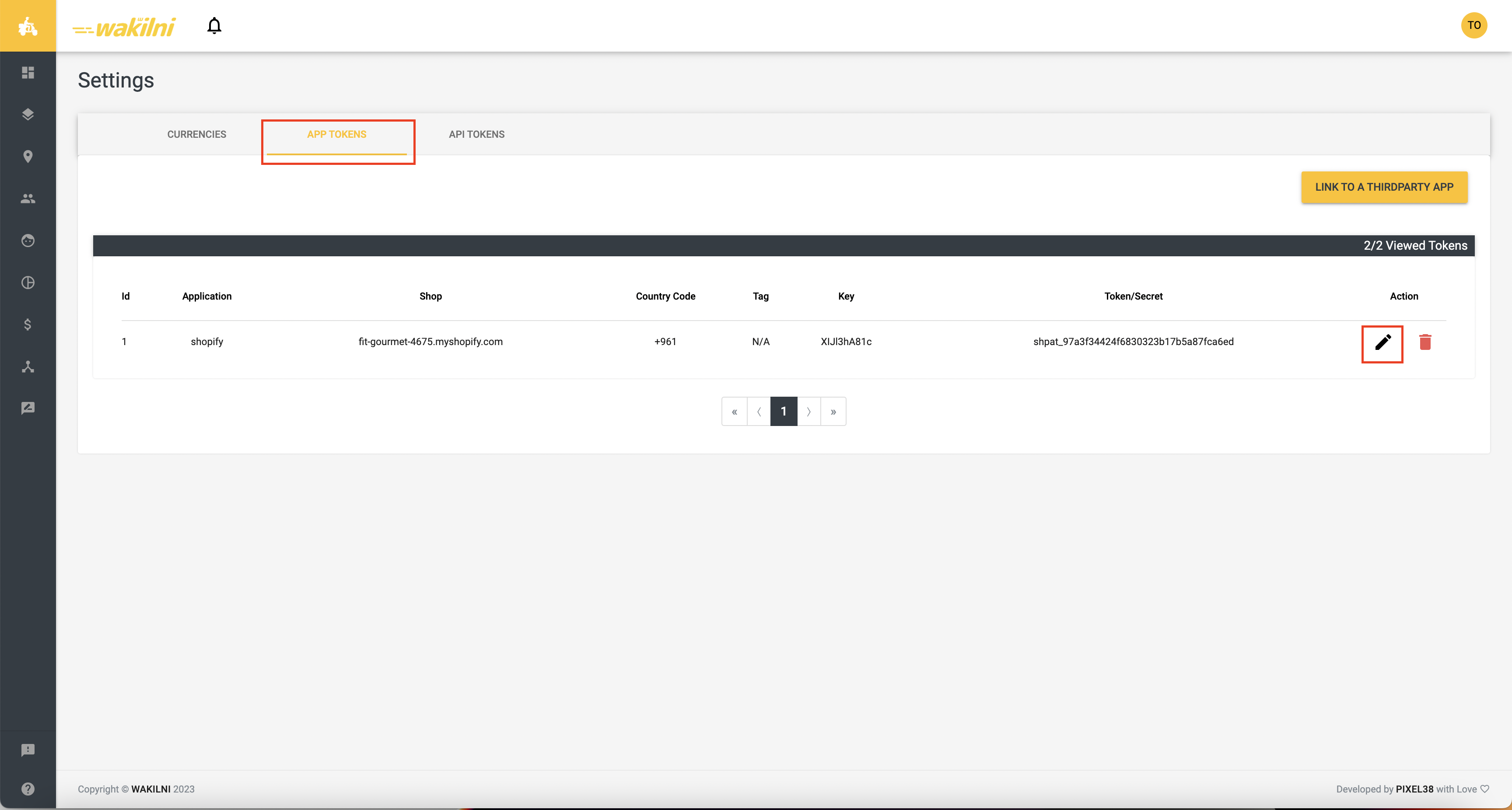2. From **APP TOKENS** tab, find your shop settings, and Click on **Edit** (Pen Icon)