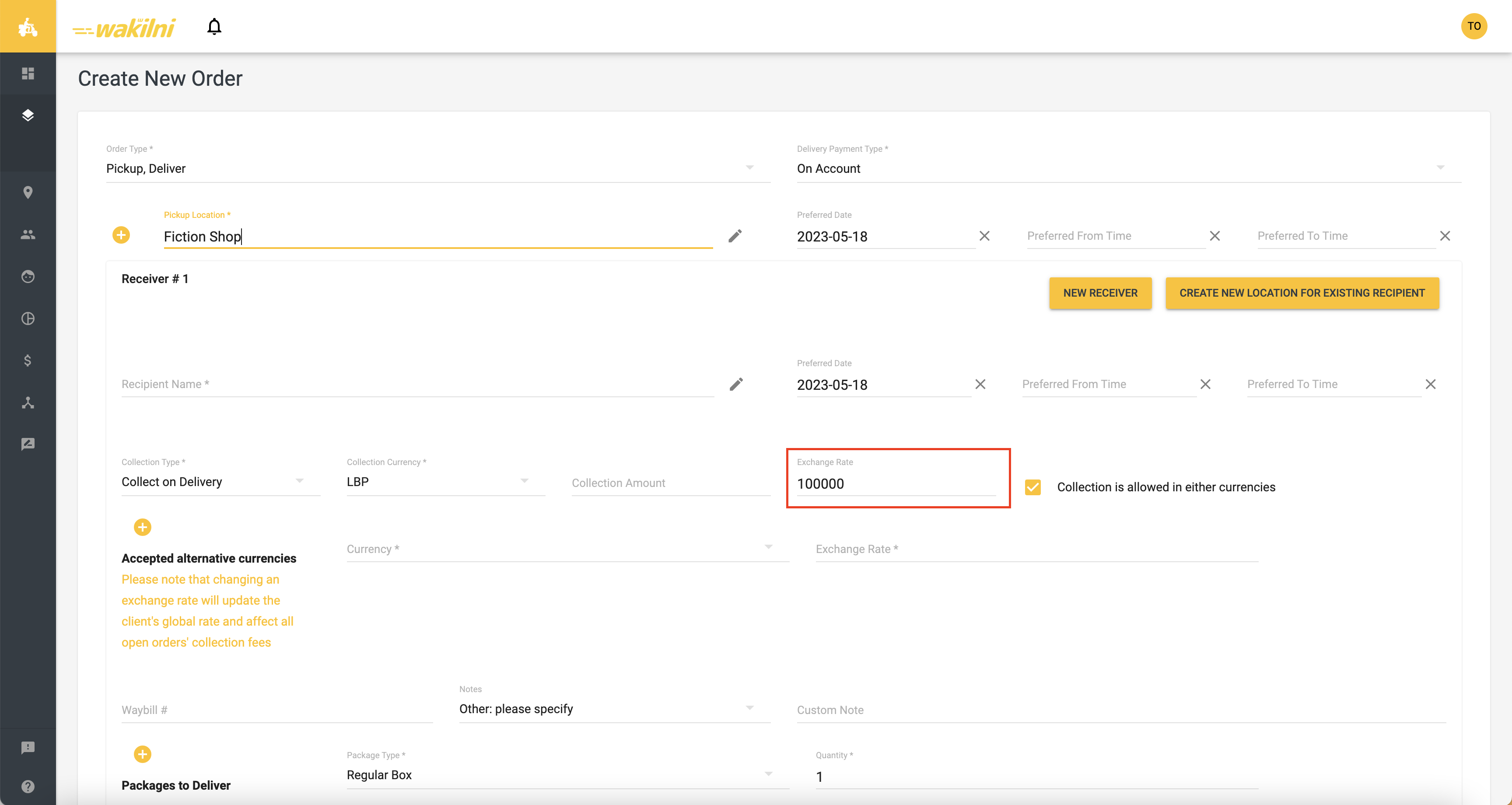 **Note:** Changing an exchange rate will update your global rate and affect all open orders' collection fees